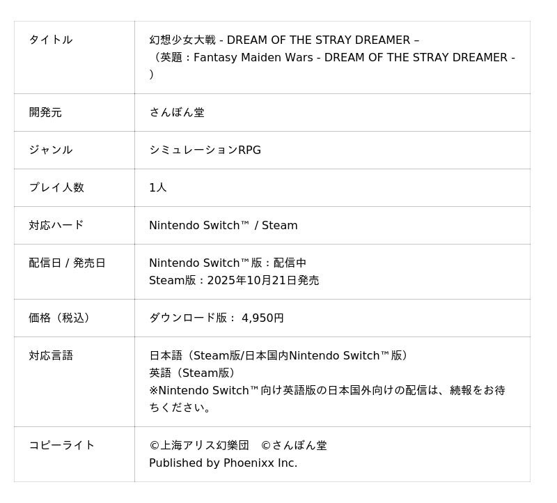 株式会社Phoenixx(フィーニックス)(東京都武蔵野市、代表取締役社長:坂本 和則)は、「東方Project」ファンゲームの弾幕シミュレーションRPG『幻想少女大戦 - DREAM OF THE STRAY DREAMER -』を、Steamにて10月21日(火)に配信開始いたします。