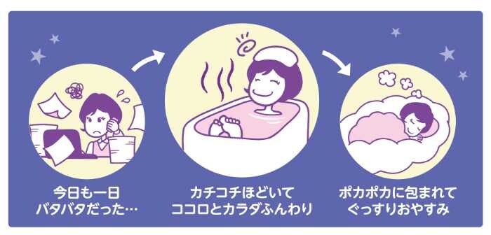 海塩のミネラルが凝り固まった身体を温めながらほぐし、湯上がりはお肌しっとり。まさに“睡眠美容”という名にふさわしい癒しのバスタイムを演出します。