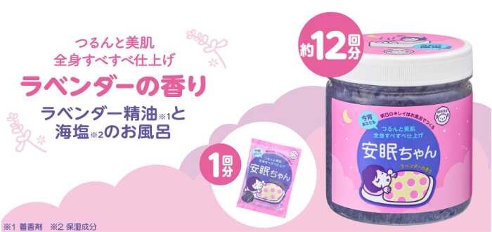 ラベンダー精油1と海塩2を配合した〈睡眠美容 安眠ちゃんたっぷりサイズ〉は、全身をすべすべに仕上げる癒しのバスタイムを演出。容量600g(約12回分)で価格は1,980円(税抜1,800円)。