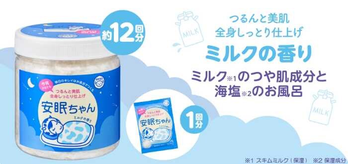 さらに、〈睡眠美容 安眠ちゃん ミルクの香りたっぷりサイズ〉も登場。ミルク3のつや肌成分と海塩2の組み合わせで、しっとり美肌を叶えます。こちらも600g(約12回分)で価格は1,980円(税抜1,800円)。