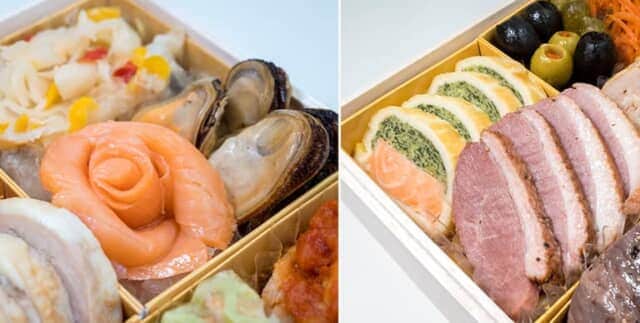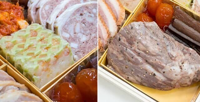 国産黒毛和牛のローストビーフやズワイガニのテリーヌ漁師風、トリュフ入りチキンガランティーヌ、サーモンとほうれん草のクリビヤック、鯵のエスカベッシュ、パーナ貝燻製オイル漬け、トラウトサーモンローズ、チキンのバスク風など計19品。