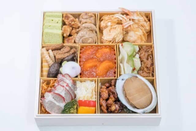 驚きの美味しさを詰め合わせた中国料理。鮑のオイスター煮 海藻添え、海老のチリソース煮、かに爪アーモンド揚げ、とびっこ翡翠蒸し、黒酢の酢豚、帆立醤油煮、烤麩(コウフ)の香味煮、くらげ甘酢和え、桃型餅など17品。