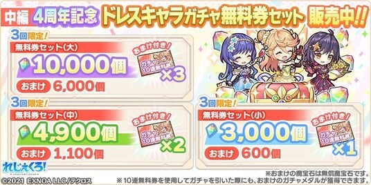 ・【中編】4周年記念ドレスキャラガチャ無料券セット(大)/(中)/(小)