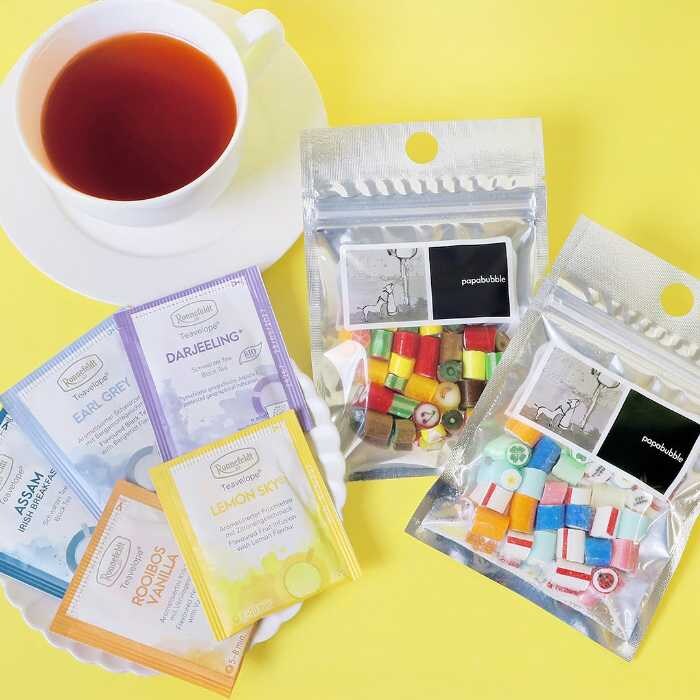 上品でシンプルなギフトボックスには、パパブブレの鮮やかなキャンディとロンネフェルト紅茶が並び、贈り物としても喜ばれます。クリスマスや誕生日、特別な日のプレゼントとしてもぴったり。
