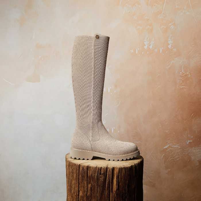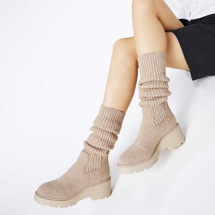 新作「Rita」は、ニット素材のレッグウォーマーを取り外すことで2wayで楽しめる万能ブーツ。ミドル丈としても、ワイドシャフトとしても履けるため、1足で幅広いスタイルに対応します。