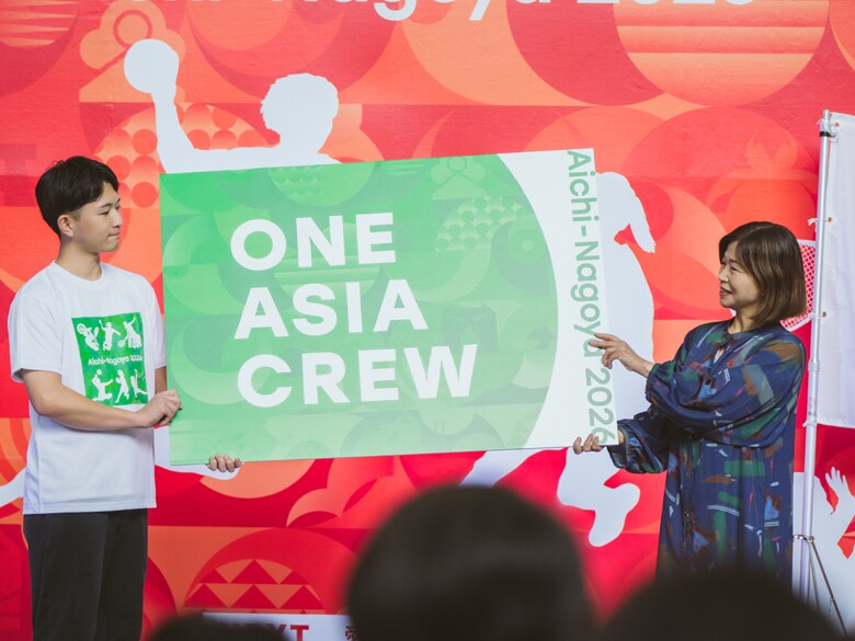 愛知・名古屋アジア大会も含めた、ボランティアのネーミングを発表したボランティア代表(左)と大久保さん続いて、大会を支えるボランティアのネーミングが発表された。3つの案から実際にボランティアとして活動する人たちによる投票の結果、「ONE ASIA CREW(ワンエイジアクルー)」に決まった。