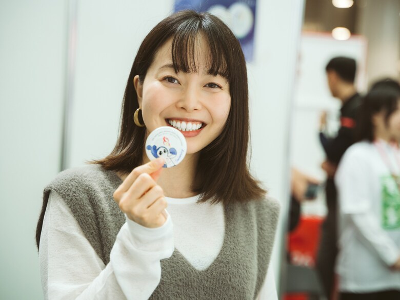 大会組織委員会でアスリート委員会の委員を務めている伊藤さん(右)この日は、缶バッジ作成ブースも、行列を作っていた。選べるデザインのうち、西田はウズミンをチョイス。大会エンブレムのイラストと「swimming」の文字をあしらってオリジナル缶バッジの完成! さっそくリュックにつけていた。