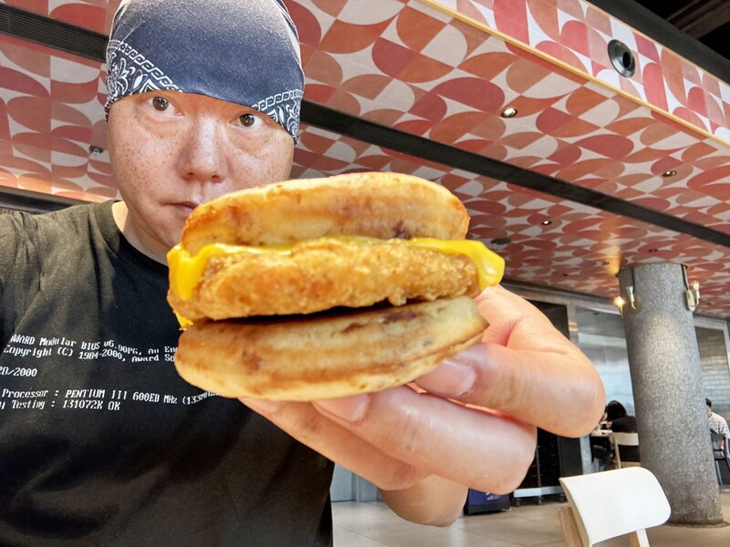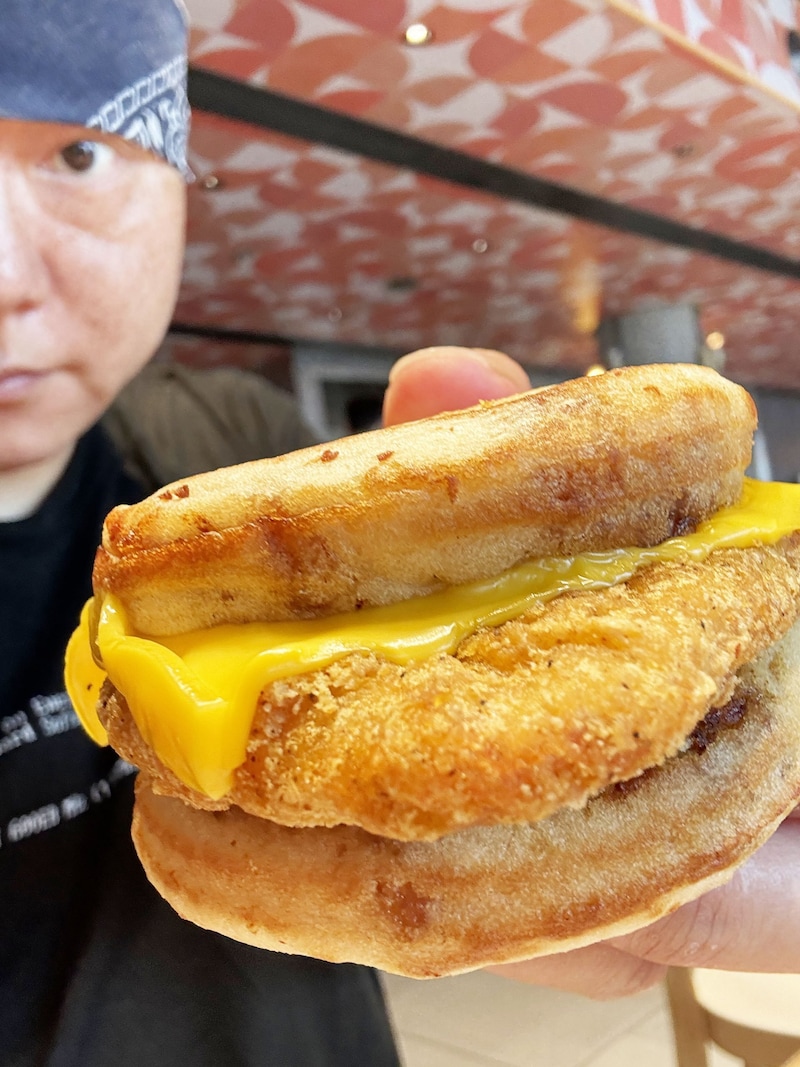その味は、すべての食材による多重なるグルメ。パンケーキのモチモチ感とともに広がる甘味、チーズによる薫りとコク、そんなチーズの恩恵を受けたチキンの旨味、そして揚げたことによるチキン肉汁と油のおいしさ、すべてが完璧。