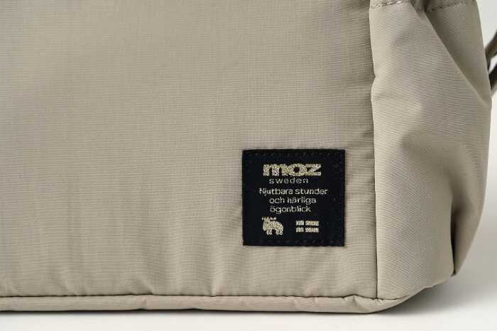 金糸刺繍のロゴワッペンが、クラシカルで上質な印象を演出。ファスナー引き手にはmozのロゴが刻印され、手に取るたびにセンスを感じさせます。