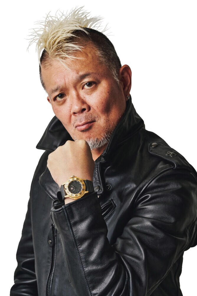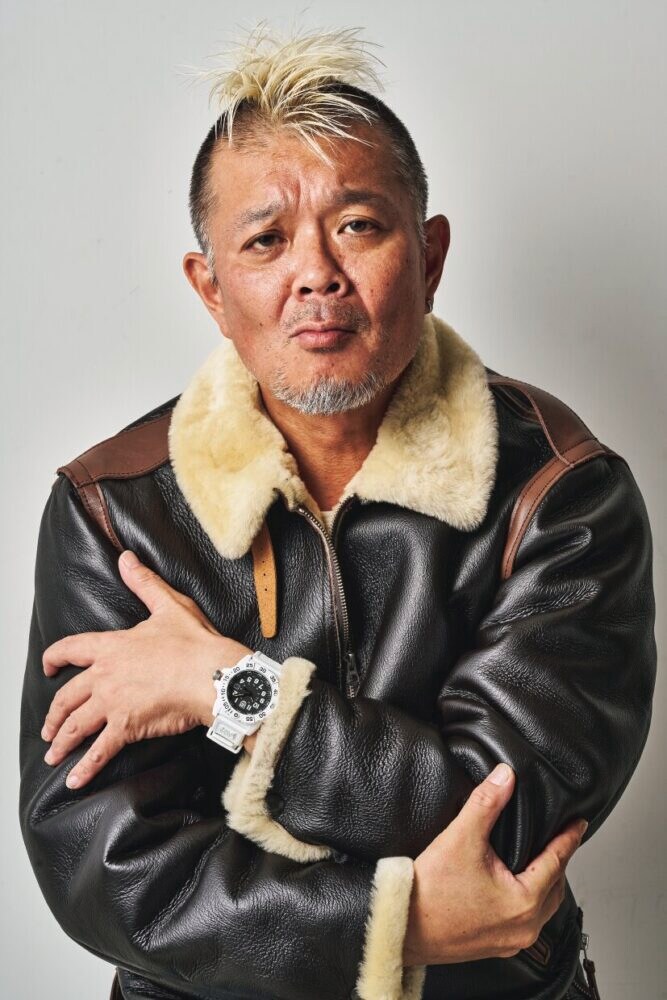 茶芯のライダースジャケットにチラリと見せるゴールドケースってゴージャスで良いでしょ。ちなみにゴールドとブラックのコンビは、俺のヘアスタイルと同じで親近感(笑)