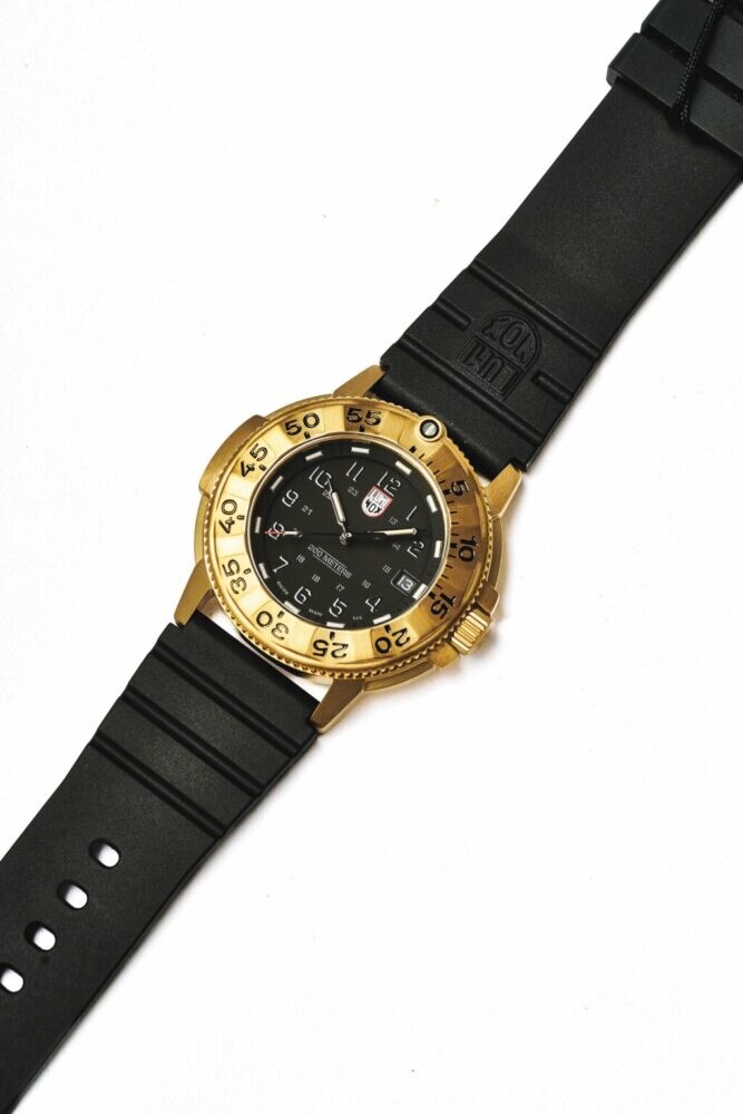 ネイビーシールズ基金25周年を記念したニューモデル。直径43㎜のゴールドIP加工ステンレススチールケースに逆回転防止ベゼルを搭載。ネイビーシールズの紋章にあしらわれているトライデントをイメージしたゴールドケースとブラックダイヤルのコントラストを特異とする点だけでなく、ルミノックス独自のライトテクノロジー(LTT)を装備することで、ルミノックスの本質である極めて高い視認性も確保されている。SPEC:ケース径/43㎜、ケース厚/12㎜、ムーブメント/Ronda 515 、防水/200m、20atm、ケース/ステンレススティール ゴールドIP加工、リューズ/ねじこみ式、ベゼル/逆回転防止機能、風防/サファイアクリスタルガラス、生産国/スイス、プライス/11万7810円