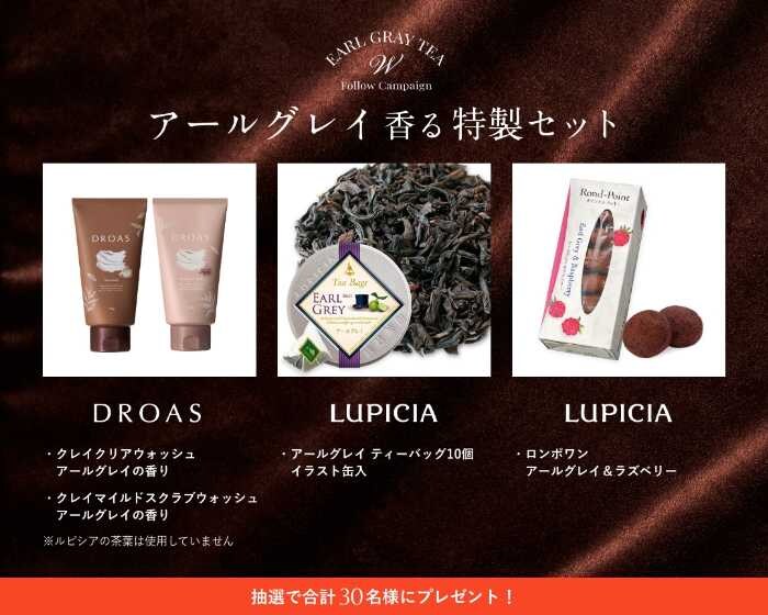 発売を記念して、世界のお茶専門店「ルピシア」とのコラボレーションキャンペーンがスタート。抽選で合計30名に「アールグレイ香る特製セット」が当たるWフォローキャンペーンを実施中です。