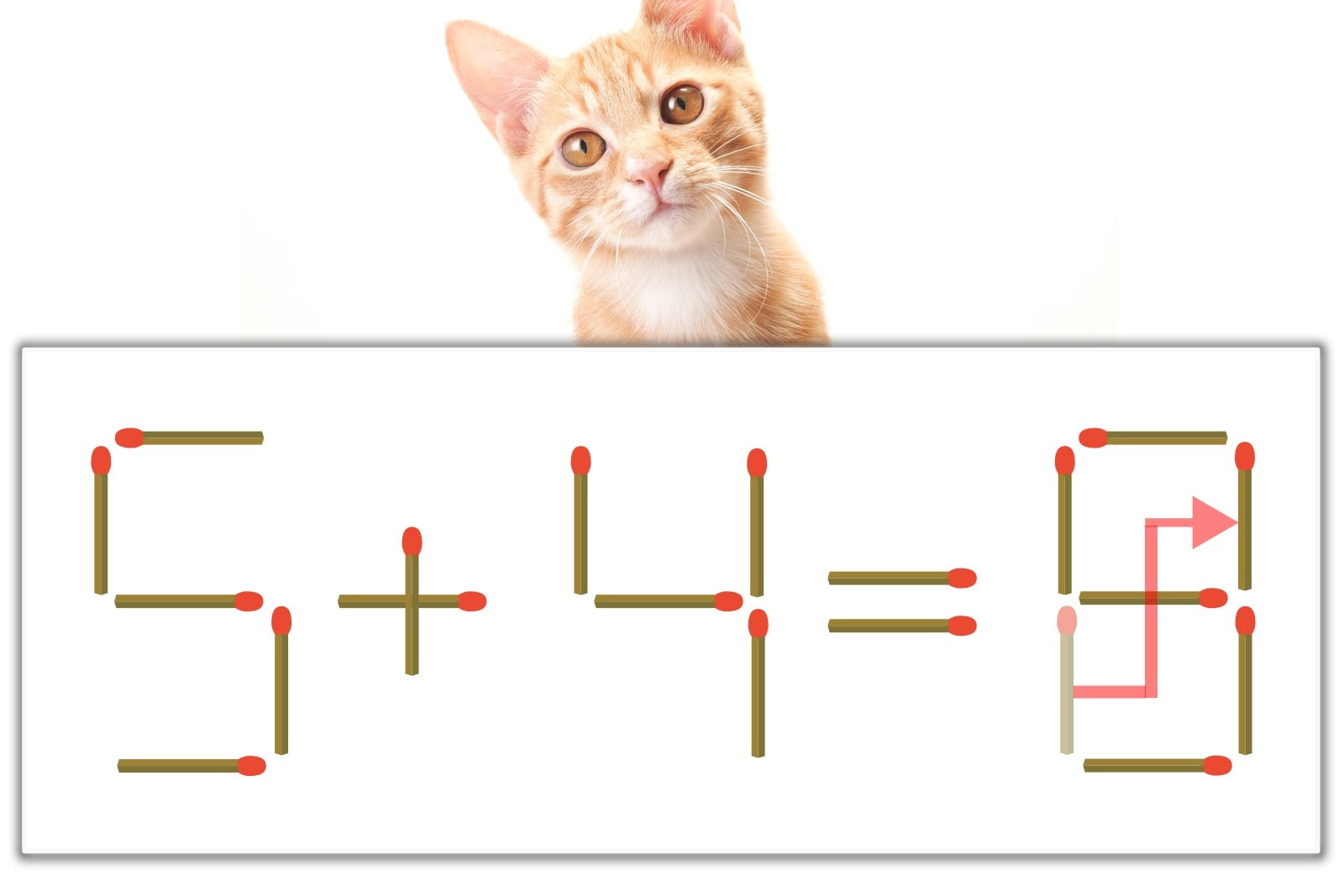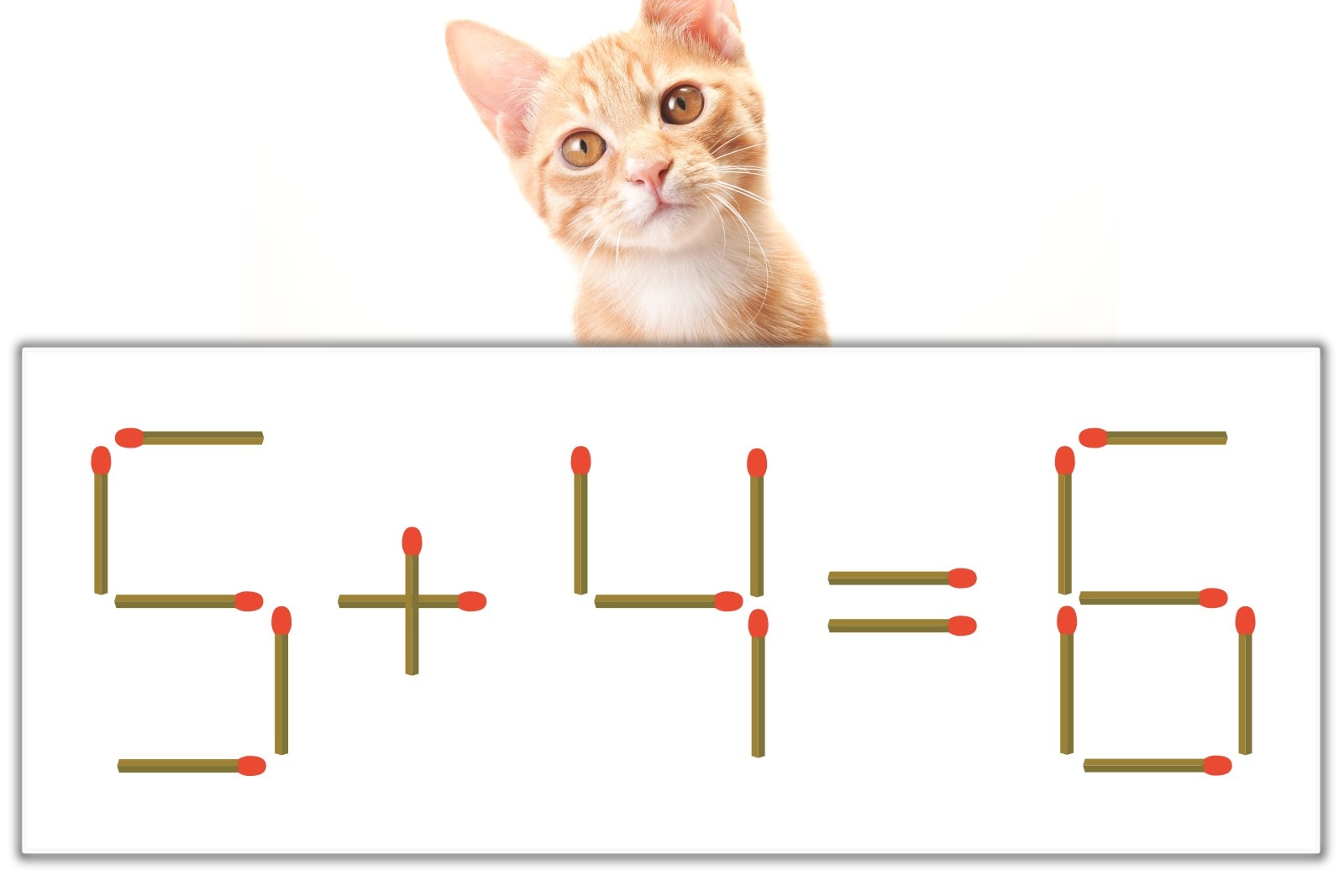 「6」のマッチ棒を1本、右上にスライドさせて「9」を作り、「5+4=9」にする。※解答は複数ある場合があります。