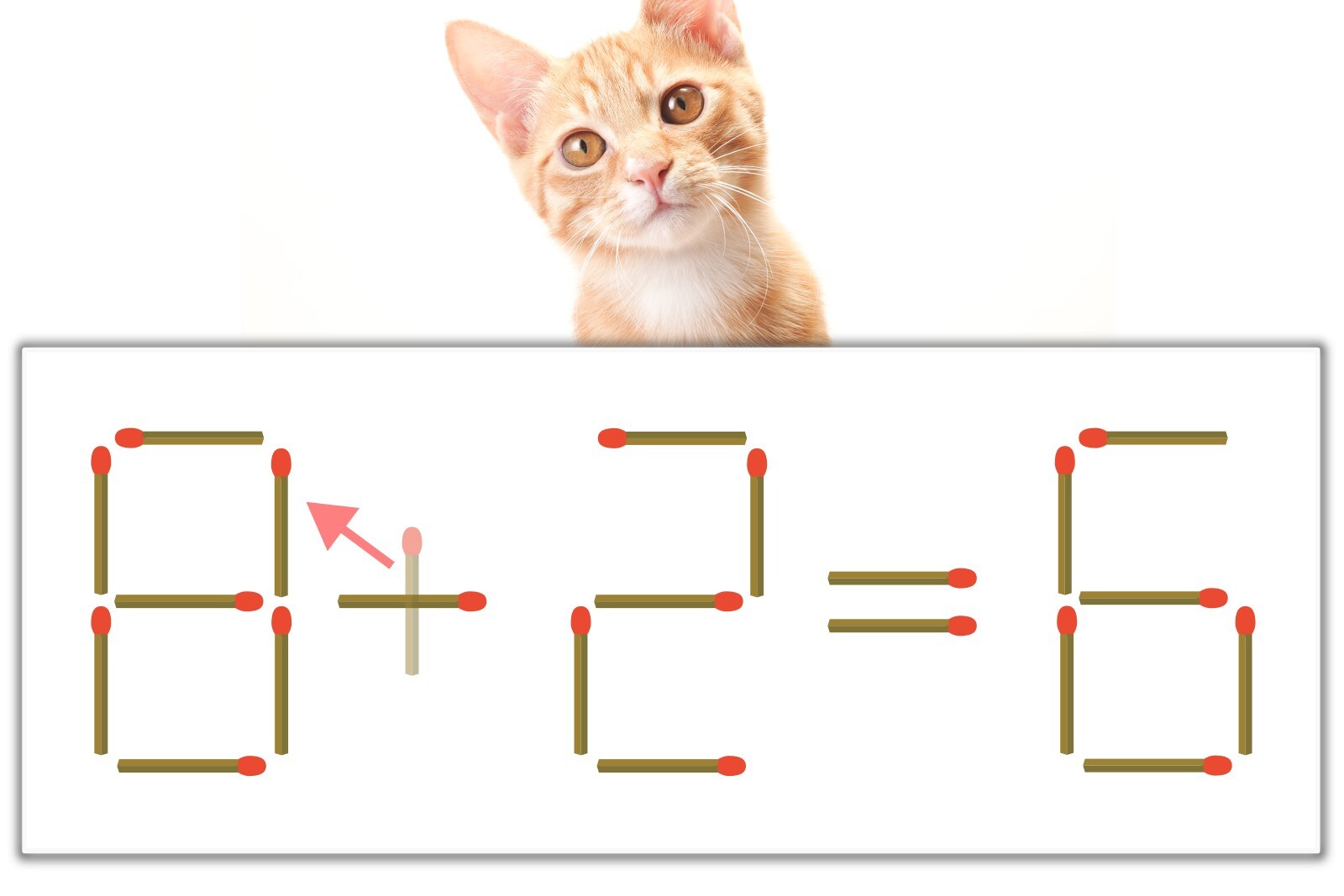 「+」のマッチ棒を1本、左にスライドさせて「8」を作り、「8-2=6」にする。※解答は複数ある場合があります。