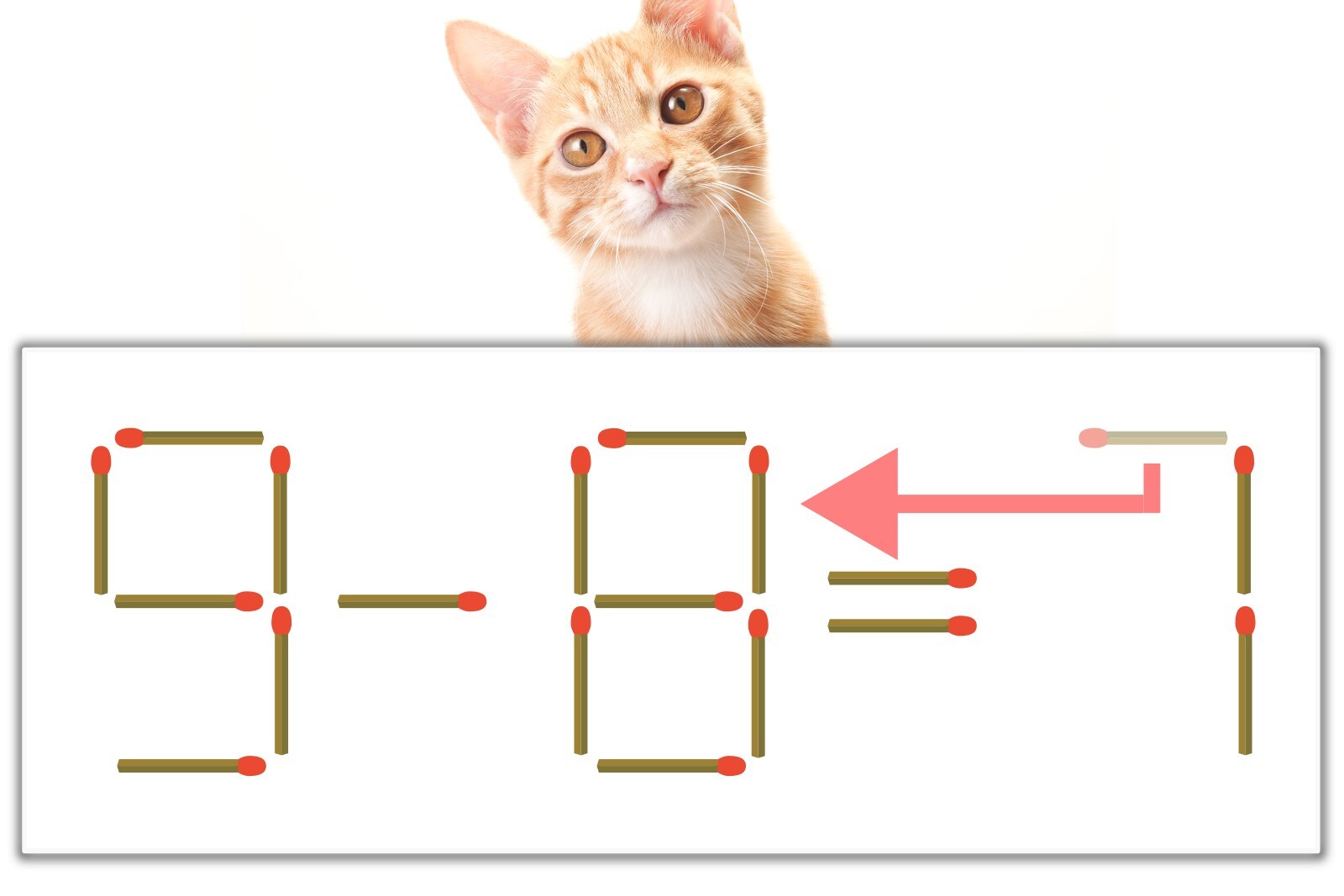 「7」のマッチ棒を1本、左 にスライドさせて「8」を作り、「9-8=1」にする。※解答は複数ある場合があります。