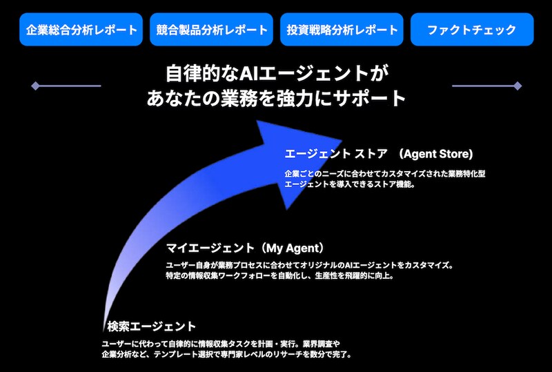 同年に次世代検索エンジン「Felo Search」をローンチすると、以降は企業向けAIエージェントプラットフォーム「Felo Enterprise」、カスタマイズ可能なエージェントを提供する「Agent Store」など、業務実装に特化したAIツールを次々と展開。