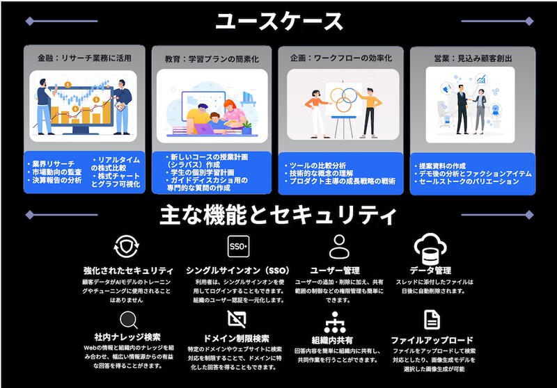 既に累計ユーザー数は120万人を超え、提案資料作成・ナレッジ検索・論文要約など、さまざまな業務シーンにおいて活用されている。