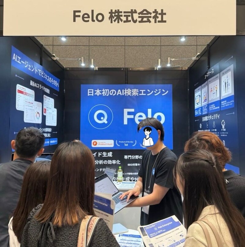 当日は、次世代多言語AI検索エンジン「Felo Search」、企業向けAIエージェント「Felo Enterprise」など、業務実装に直結するプロダクト群を展示し、日本語に強い検索×RAG、SSO/権限管理、国内AWS運用などの特長を紹介した。