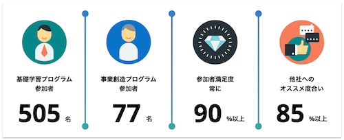 Q-Questは2023年度から3年にわたって開催されており、基礎学習プログラムは505名、事業創造プログラムには77名が参加。