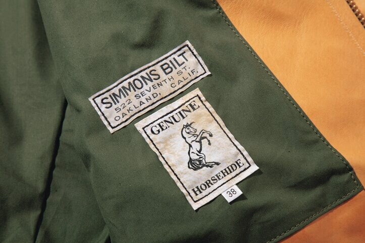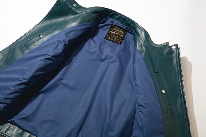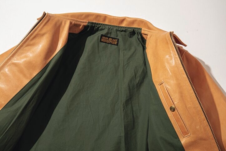アイアンハートのタグはエリ裏に、コラボの証しであるシモンズビルトのタグはフロント内側に配される。コットンライニングはオリーブを採用。ヌメ革とオリーブの配色が新鮮だ。ややタイトなシルエットだがアクションプリーツによって腕まわりの可動域を確保。20万9000円