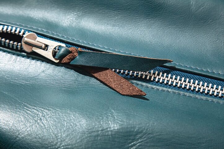 上モデルのカラバリで味わい深いターコイズブルーが特徴。下地を染料で染め上げ、その上に顔料で仕上げているため、着込むほどに奥行きを増すエイジングが味わえる。19万8000円
