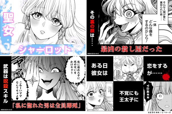 “聖女”として国中から愛されるシャーロット。だが、その裏の顔は、スキル「私に惚れた男は全員即死」を使い、男を誑(たぶら)かしては呪殺する“凄腕の殺し屋”だった!ある日、王太子を暗殺しようとした彼女は、不覚にも恋に落ちてしまう! 「私に惚れた男は死ぬ」──。だが、私が惚れた男は……?
