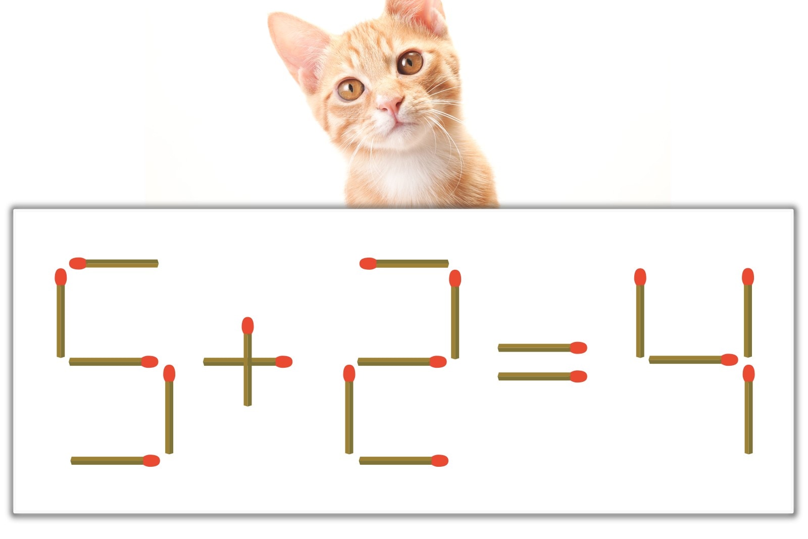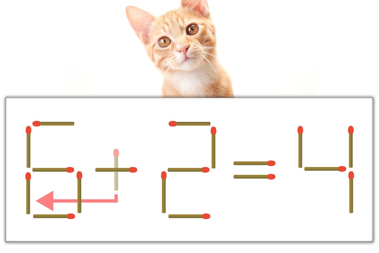 「+」のマッチ棒を1本、左にスライドさせて「6」を作り、「6-2=4」にする。※解答は複数ある場合があります。