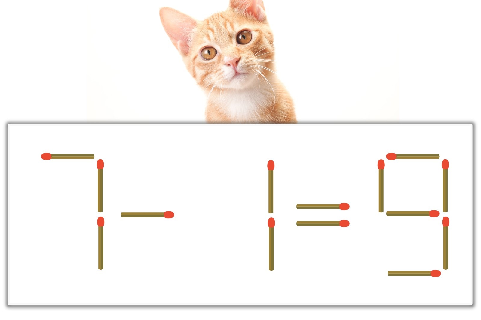 「9」のマッチ棒を1本、左下にスライドさせて「6」を作り、「7-1=6」にする。※解答は複数ある場合があります。