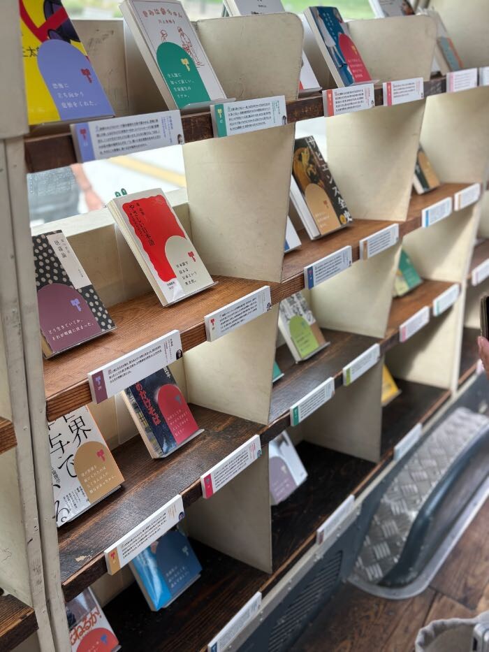 「本の試食」から始まる4つのステップで、誰かの「人生が動き出した本」と出会う、ブックバスの中は、まるでギャラリーのような空間になっており、どちらを見ても本の世界観に浸ることができ、思わずお写真を撮りたくなる場所ばかり、どちらの本にも選書者の実体験に基づいたメッセージが添えられています。