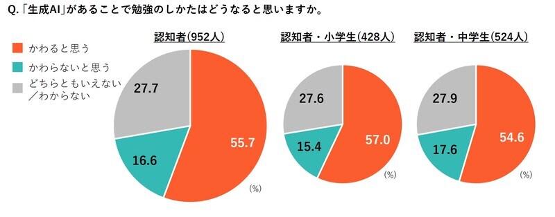 生成AIが勉強のしかたにどのような影響を与えるのかを尋ねたところ、「変わると思う」と答えた子どもは55.7%と半数を超えました。子どもたちは学びの場面でAIを活用することに、大きな変化があると感じているようです。