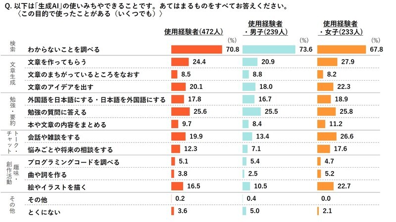 性別で見ると、女子は「雑談や相談をする」「イラストを描いてもらう」といった検索以外の使い方が男子より高い割合を示しました。単に答えを探すだけではなく、会話相手や創作のパートナーとしてAIを受け入れている様子がうかがえます。生成AIは情報を得るための手段にとどまらず、子どもたちの好奇心や表現欲求を支えるツールへと広がっているのです。