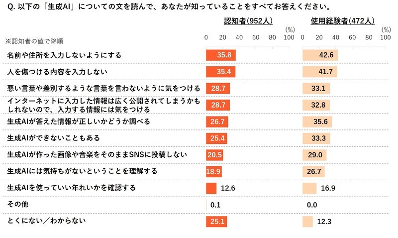 一方で、「安心できる」「信用できる」と回答した割合は半数を下回り、信頼性への不安が残っていることも明らかになりました。さらに、生成AIを使う際に気をつけるべき点についての理解は十分とは言えません。「名前や住所を入力しないようにする」と答えた子どもは3割台にとどまり、情報管理や安全な利用方法がまだ浸透していない現状が浮き彫りになっています。 この結果からは、子どもたちが新しい技術を好意的に受け止めつつも、安全に使うための知識やルールが追いついていない状況が見てとれます。期待と不安が入り混じる中で、安心して活用できる環境を整えていくことが今後の課題だと言えるでしょう。
