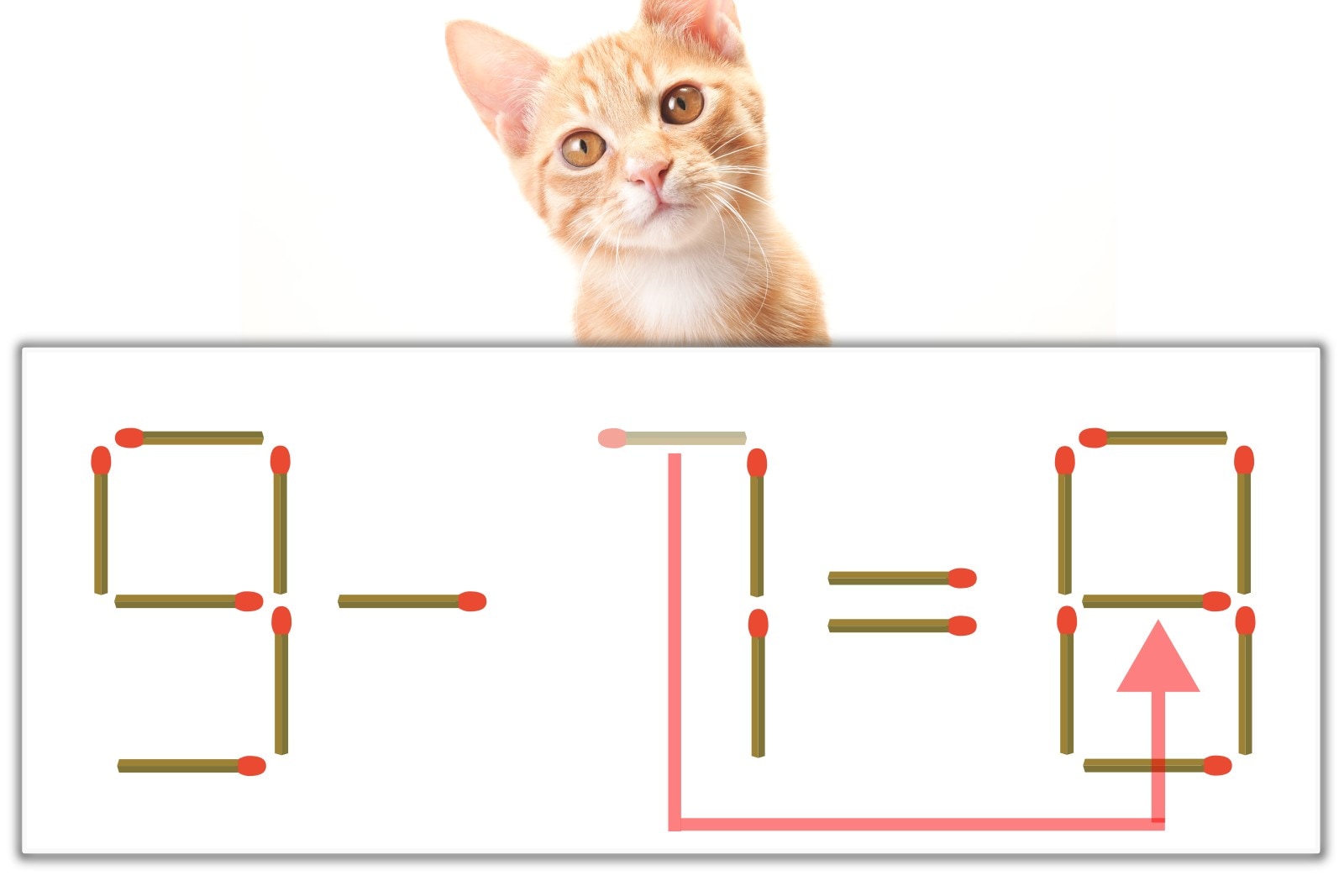 「7」のマッチ棒を1本、右にスライドさせて「8」を作り、「9-1=8」にする。※解答は複数ある場合があります。