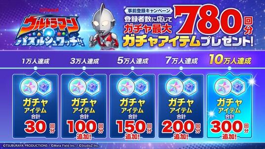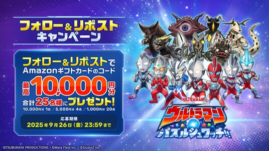 StudioZ株式会社(本社:東京都港区、代表取締役CEO:古瀬祥一、以下「StudioZ」)は、円谷フィールズホールディングスのデジタル事業戦略子会社であるメタフィールド株式会社(本社:東京都渋谷区、代表取締役社長 大塩 忠正、以下「メタフィールド」)との共同事業として、株式会社円谷プロダクション(本社:東京都渋谷区、代表取締役社長 永竹 正幸、以下「円谷プロダクション」)の監修のもと、開発中の新作スマートフォン向けアプリゲーム『ウルトラマン パズルシュワッチ!!(通称:パズシュワ)』の事前登録を開始いたしました。