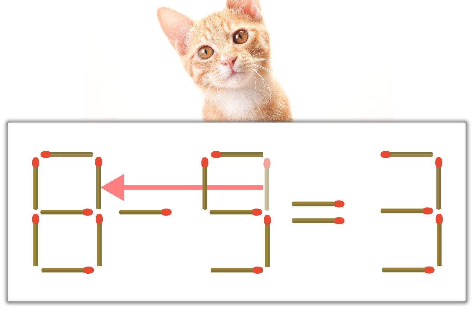 「9」のマッチ棒を1本、左にスライドさせて「8」を作り、「8-5=3」にする。※解答は複数ある場合があります。