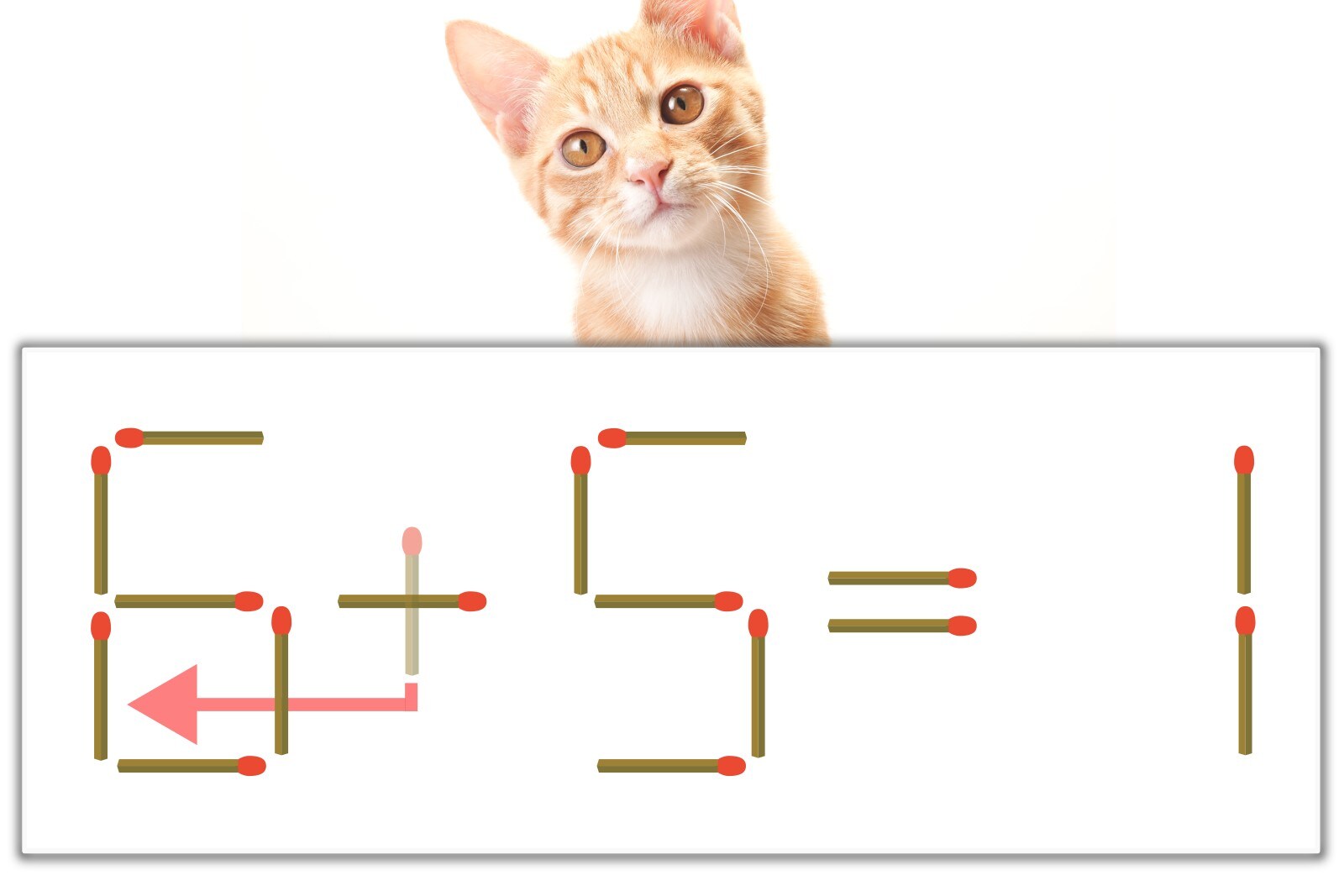 「+」のマッチ棒を1本、左にスライドさせて「6」を作り、「6-5=1」にする。※解答は複数ある場合があります。