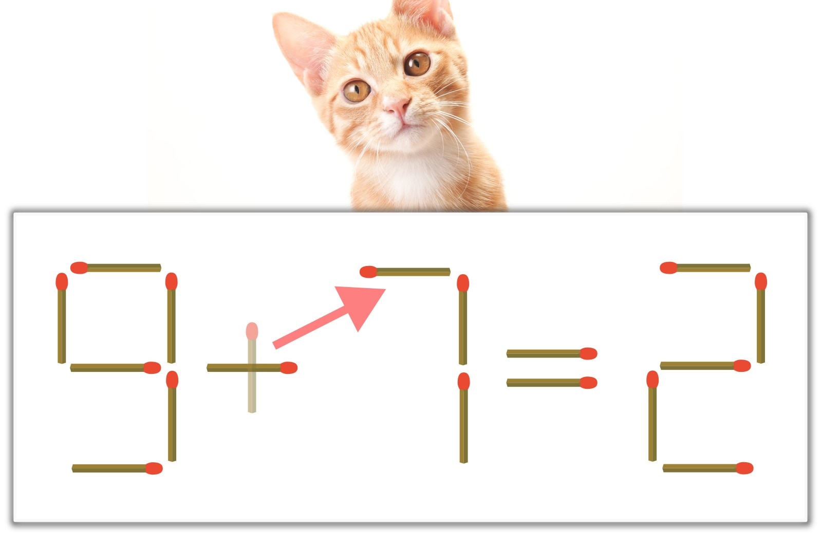 「+」のマッチ棒を1本、右にスライドさせて「7」を作り、「9-7=2」にする。※解答は複数ある場合があります。