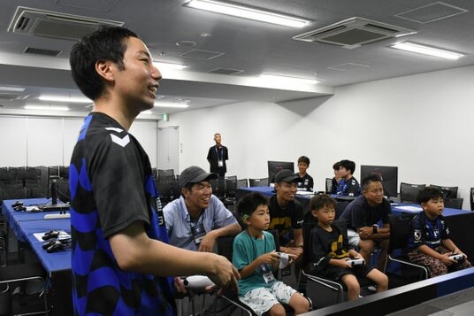 GENKIモリタさんは、ガンバ大阪のクラブ・リレーションズ・オフィサー阿部浩之さんとも対戦。エキシビジョンマッチの後は、小学生チーム、中高生チームと順番にゲームで交流を図りました。「書いてあるように操作ができれば、手話も言葉もいらないので、その点では、分け隔てなく同じフィールドで楽しめました。海外のeスポーツ大会に出る際は、ゲーム中には言葉の必要がなかったことを思い出しましたね」とゲーム特有のコンテンツの力を実感。