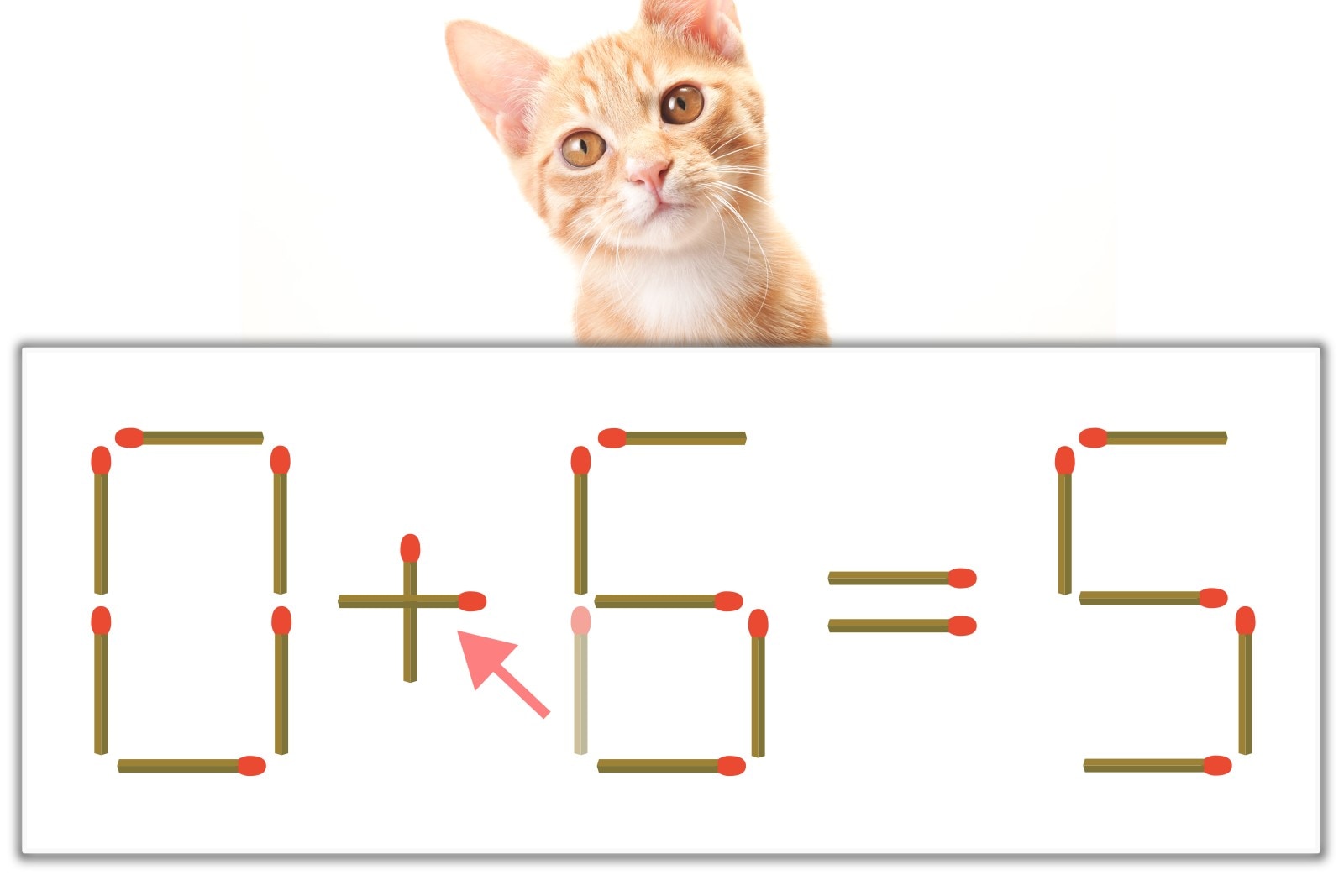 「6」のマッチ棒を1本、左にスライドさせて「+」を作り、「0+5=5」にする。※解答は複数ある場合があります。