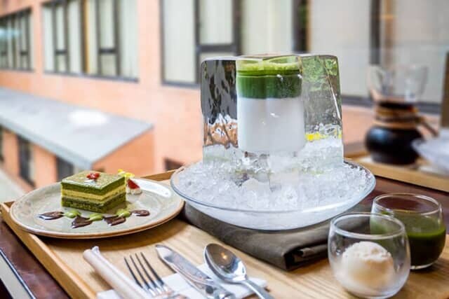 ▲氷の器の「アイス抹茶ラテ」 ¥3,300(税サ込)、ケーキセット ¥4,200(税サ込)