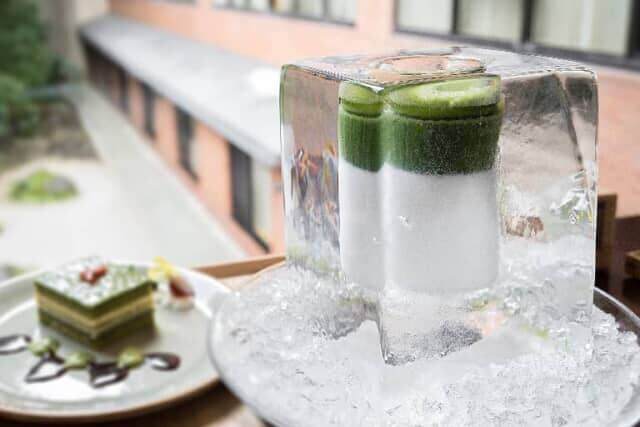 暑い季節にピッタリの涼し気な「アイス抹茶ラテ」は、実物の氷の器を目の前にすると驚くほどの大きさ。72時間凍らせた特注の氷の器は存在感たっぷりの、フォトジェニックなドリンクです。