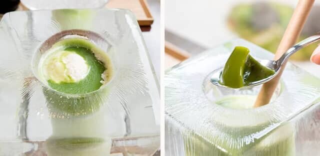 バニラアイスと共に、ドリンクと同じ抹茶を使った抹茶ゼリーも別添えで用意。そのまま食べることもできますが、抹茶ゼリーは沈め、バニラアイスは氷の器に浮かべて抹茶フロートとしても楽しめます。