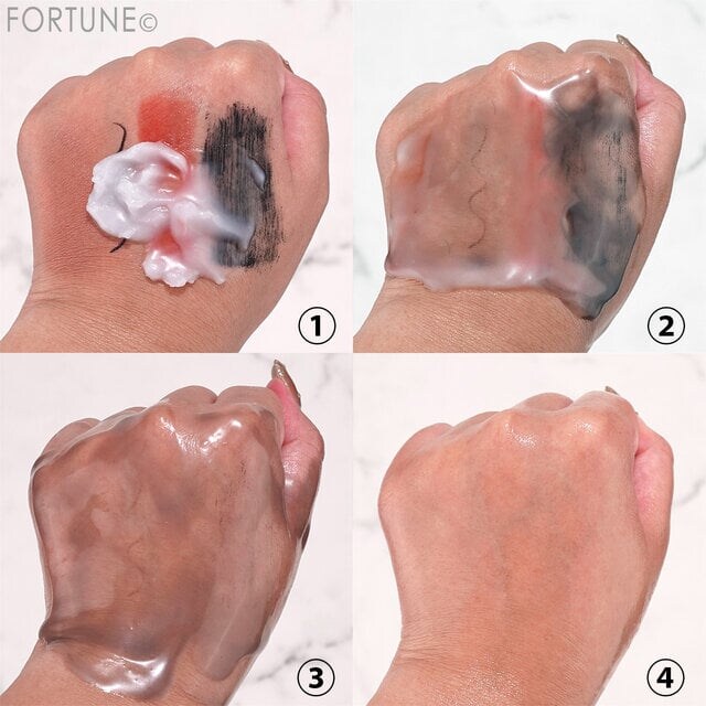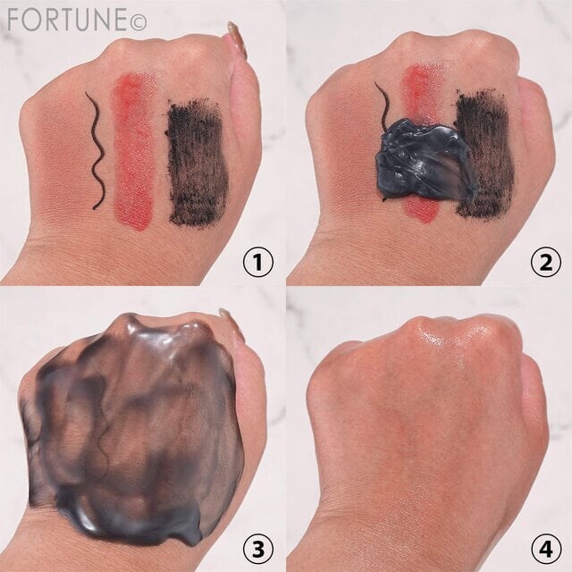 「ポアスムージング クレンジングバーム ブラック」を実際に落としてみると、バームを手にのせた瞬間からスルッととろけて、黒のオイルがなじむように広がりました。