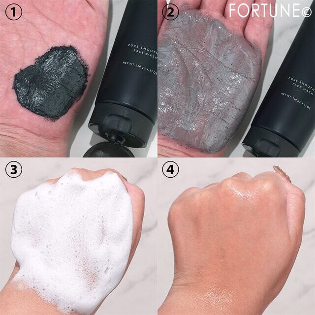「ポアスムージング フェイスウォッシュ ブラック」は、粘り気のあるペーストが、泡立てるともちもちの泡に変化。弾力のあるへたりにくい泡がクッションとなり、摩擦を抑えて角栓や毛穴をケアできます。