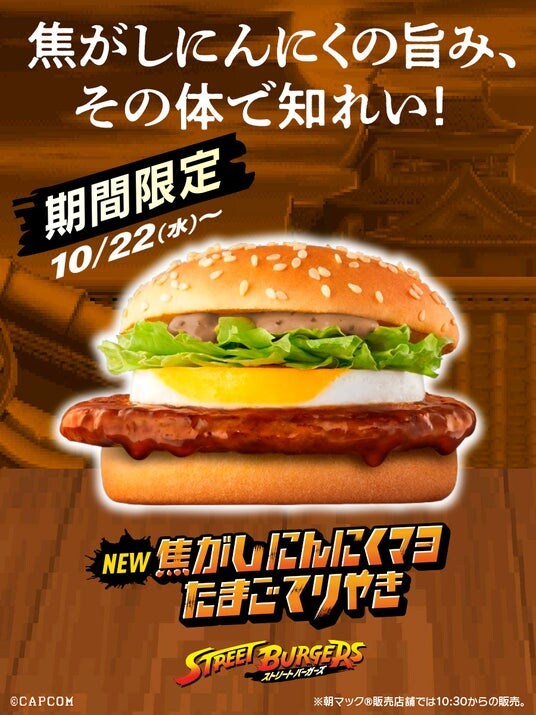 本コラボでは、「ストリートファイター」シリーズの人気キャラクターを彷彿とさせるような3種類のバーガー「焦がしにんにくマヨたまごてりやき」(リュウ)、「油淋鶏マヨチキン」(春麗)、「トリチ(R)」(ケン)が登場。