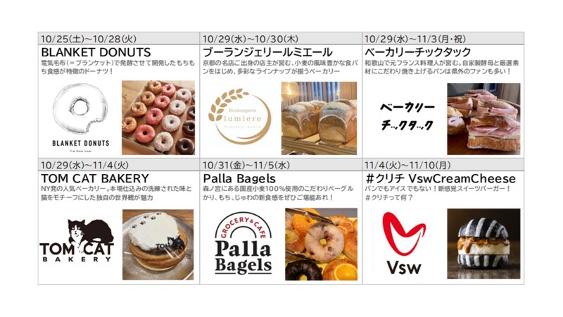 ほかにも、北海道や東京、三重など各地のベーカリーがそろうので、この機会に味わってみてはいかがでしょうか。