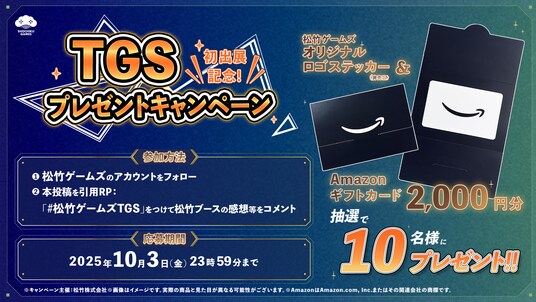 初出展を記念して、松竹ゲームズ公式SNSにてキャンペーンを実施いたします。アカウントをフォロー、また該当投稿を引用リポストし #松竹ゲームズTGSと一緒に松竹ゲームズブースの感想を投稿いただいた方抽選で10名さまにAmazonギフトカード2,000円分をプレゼントいたします。