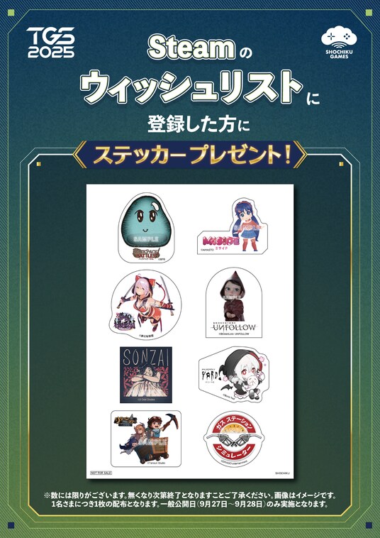 また、ブースでは東京ゲームショウ限定となるステッカーをはじめ、ノベルティをご用意しております。さらに、松竹ゲームズ初出展を記念して、公式SNSにてプレゼントキャンペーンを実施予定です。詳細は松竹ゲームズ公式Xをご覧ください。