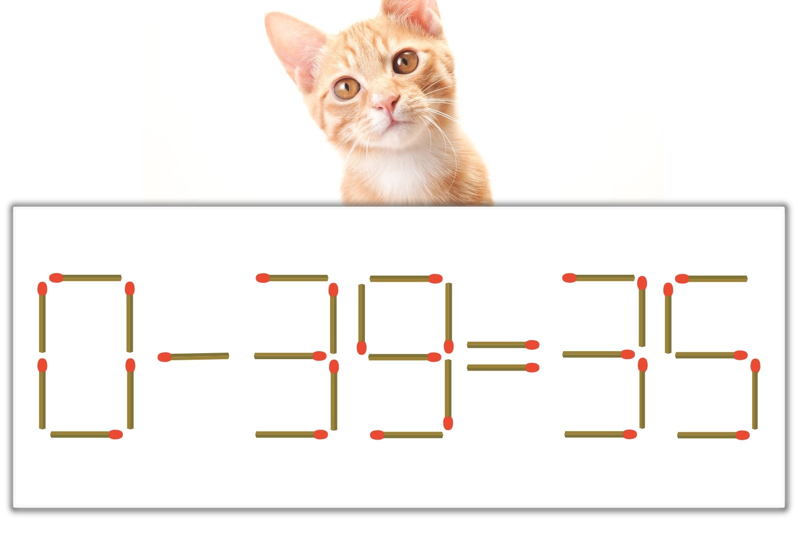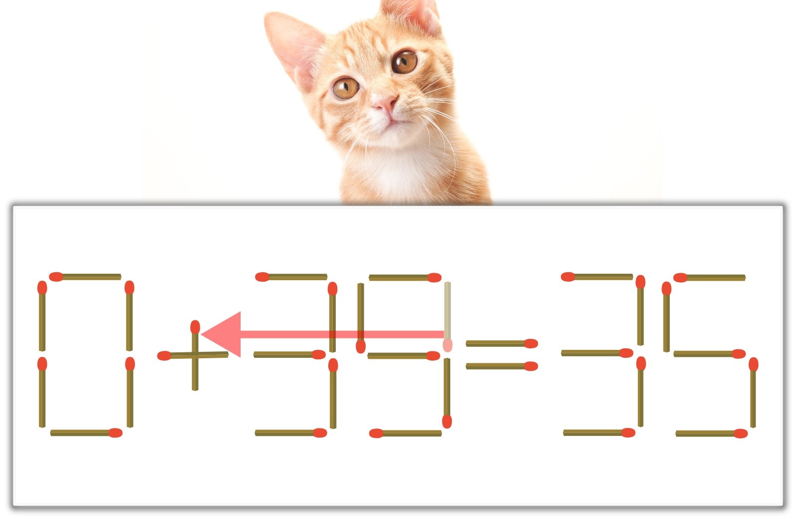 「9」を別の数字に変化させると答えが導き出せます。「9」のマッチ棒を1本移動して、「-」を「+」にしてみましょう。すると、「0+35=35」が成立します。