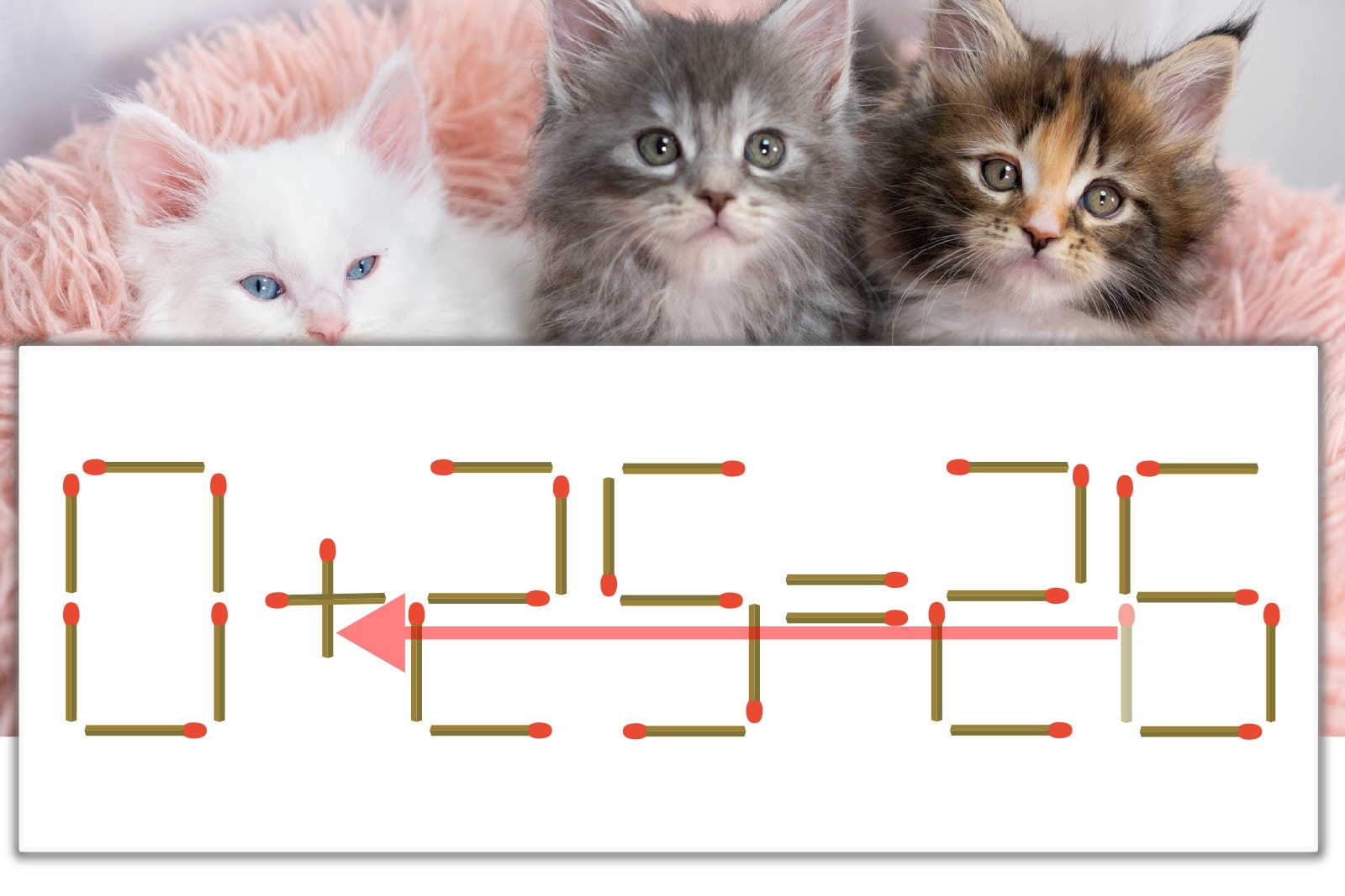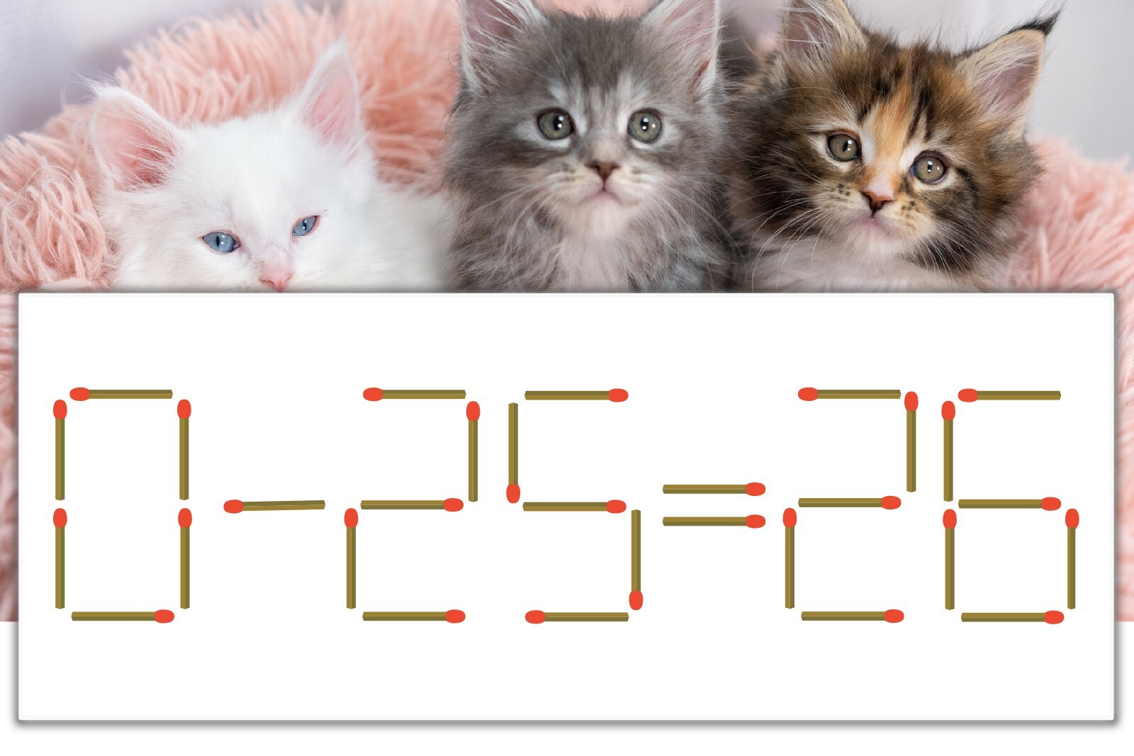 「6」を別の数字に変化させると答えが導き出せます。「6」のマッチ棒を1本移動して、「-」を「+」にしてみましょう。すると、「0+25=25」が成立します。